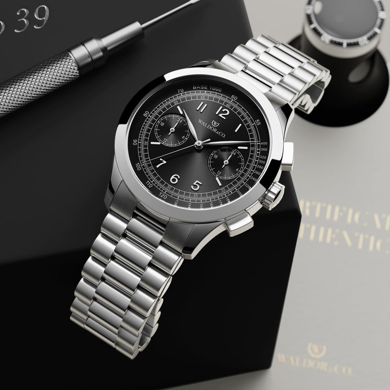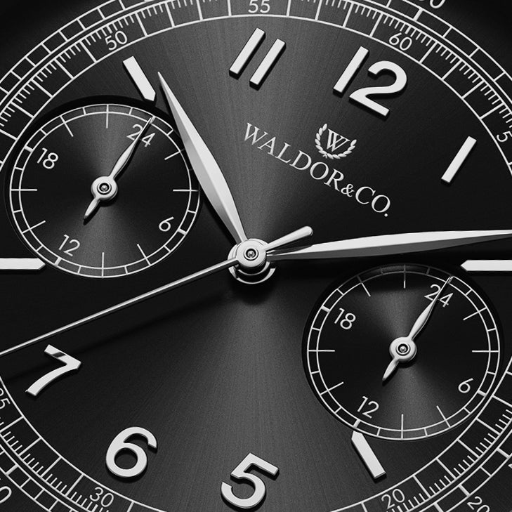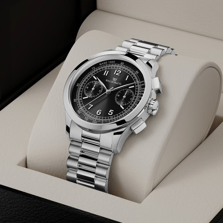The black dial in brass has a sunray finish that dances with the light, enclosed by a durable sapphire crystal that guards against scratches and reflections. The chronograph functionality is elegantly displayed through sub-dials, offering a balanced composition that is both practical and aesthetically pleasing.