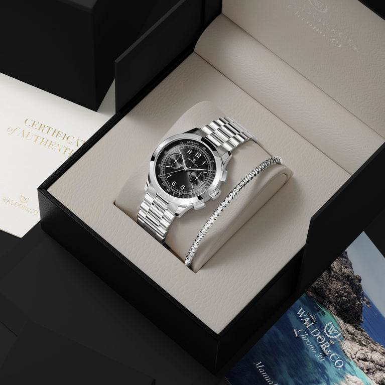 En rund herrklocka i rodiumpläterat silver från WALDOR & CO. med svart sunray urtavla och en sekundvisare. Seiko urverk. Modellen är Chrono 39 Porto Cervo.