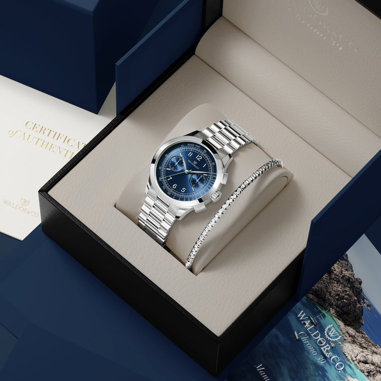 Packaging: Blue box with beige leather interior, certificate and manual