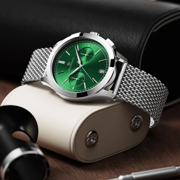 The Chrono 39 Sardinia merges style and substance with its classic 39mm silhouette and vibrant green brass dial. Its polished stainless steel indices and hands add a lustrous touch, set under sapphire crystal for enduring clarity.