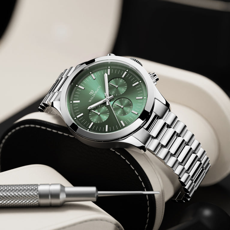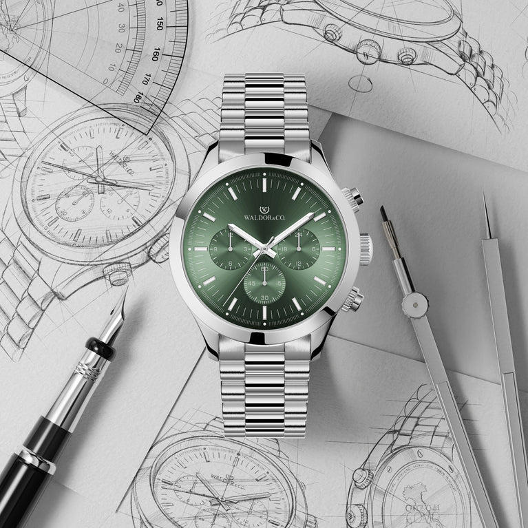 A round mens watch in rhodium-plated silver from Waldor & Co. with green sunray dial and a second hand. Seiko movement. The model is Chrono 44 Como 44mm.