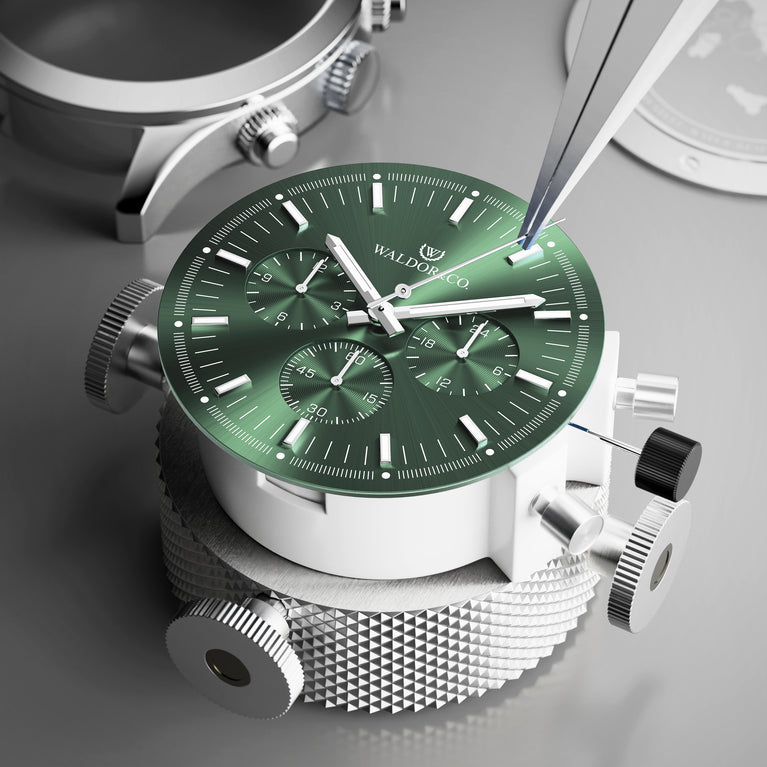 At the heart of the Chrono 44 Como is its unique green sunray dial, made from the finest brass. The green shade is enhanced with a sunray effect that catches the eye with its shifting play of light. As the dial is exposed to the sun, it creates a dynamic depth, making the green not just a color, but a lively, engaging element of the watch's design.