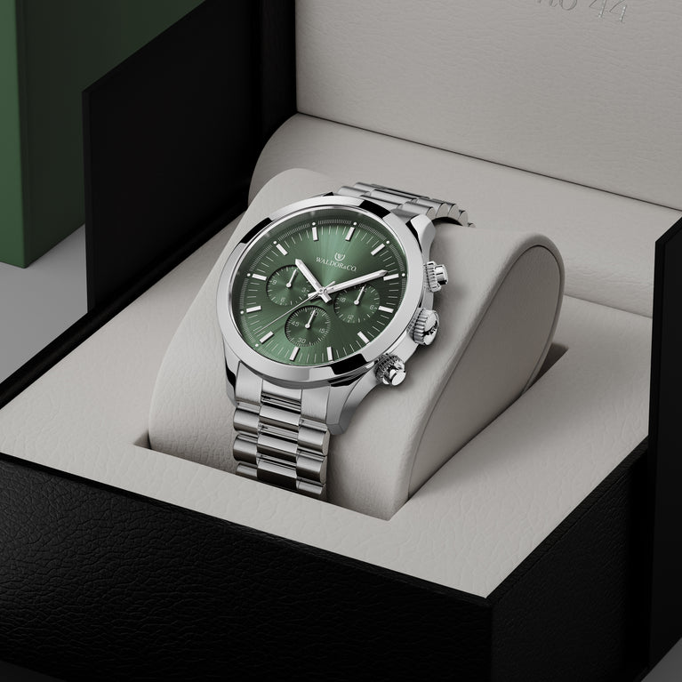 The Chrono 44 Como boasts a striking aesthetic with its 44mm case and a captivating green sunray dial, which plays with the light to create a dynamic visual effect. The luminous indexes and hands ensures readability while enhancing the watch's sleek and modern design. The rhodium-plating on both the case and strap gives it a sophisticated sheen.