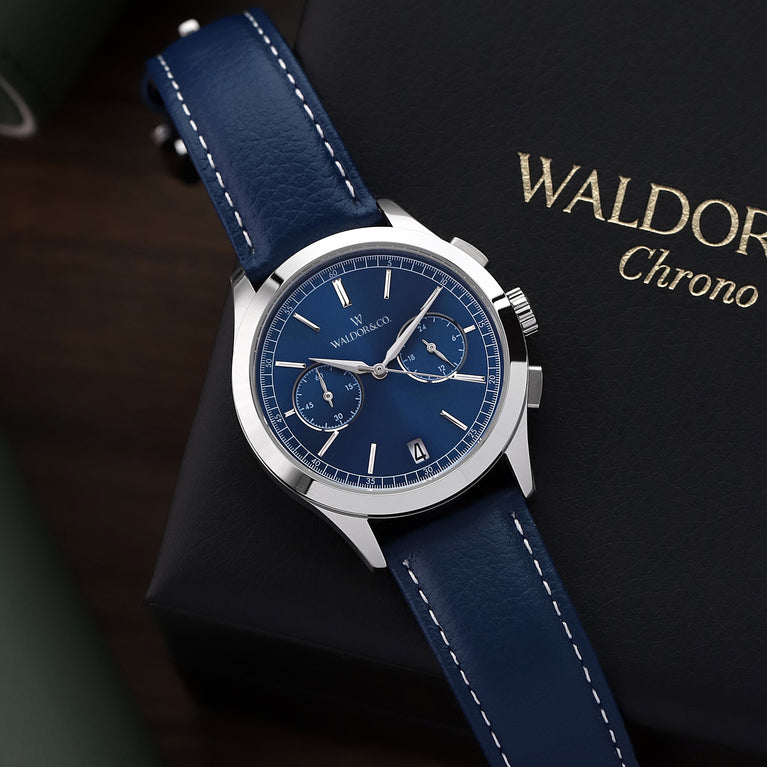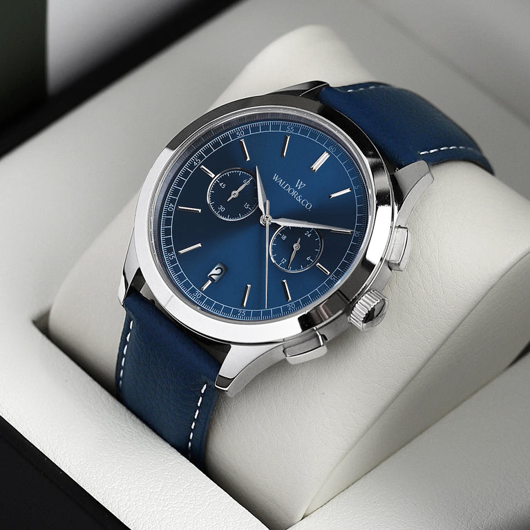 Strap: Genuine blue leather, clasp in rhodium-plated stainless steel